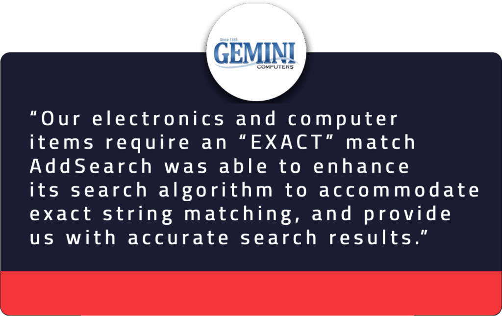 Gemini Computers, a valued customer, witnessed the transformative power of AddSearch in enhancing search result accuracy on their e-commerce platform. This implementation allowed them to offer a streamlined, user-centric experience, effectively guiding customers to their sought-after products. Discover more about their journey with AddSearch.