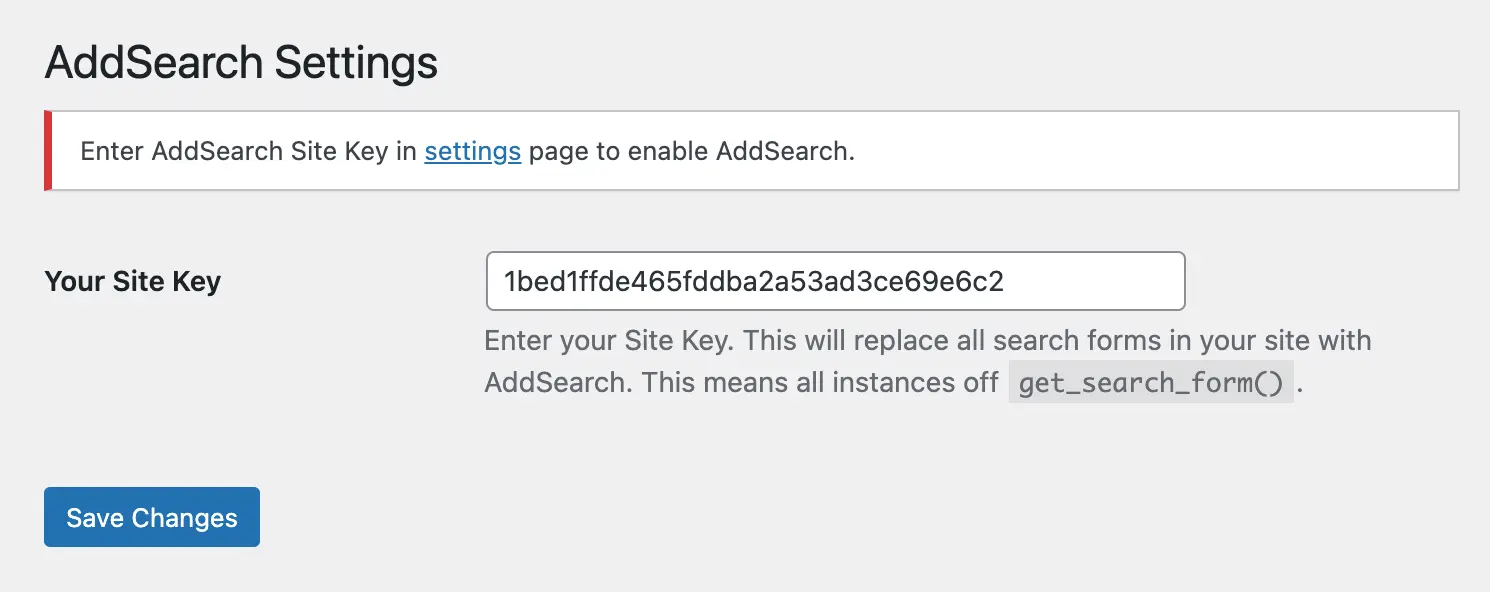 Your account’s site key is required for the plugin to access the search index. You can copy the site key from the AddSearch dashboard and paste it to the plugin’s settings in the WordPress dashboard.