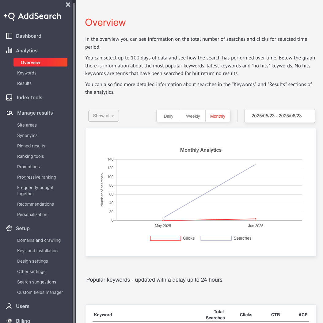 AddSearch offers transparent pricing plans based on query volume and feature needs. All plans include core e-commerce search functionality, and Premium or Enterprise tiers unlock advanced tools like AI search, ranking management, and expert implementation. For more information, visit our pricing page.